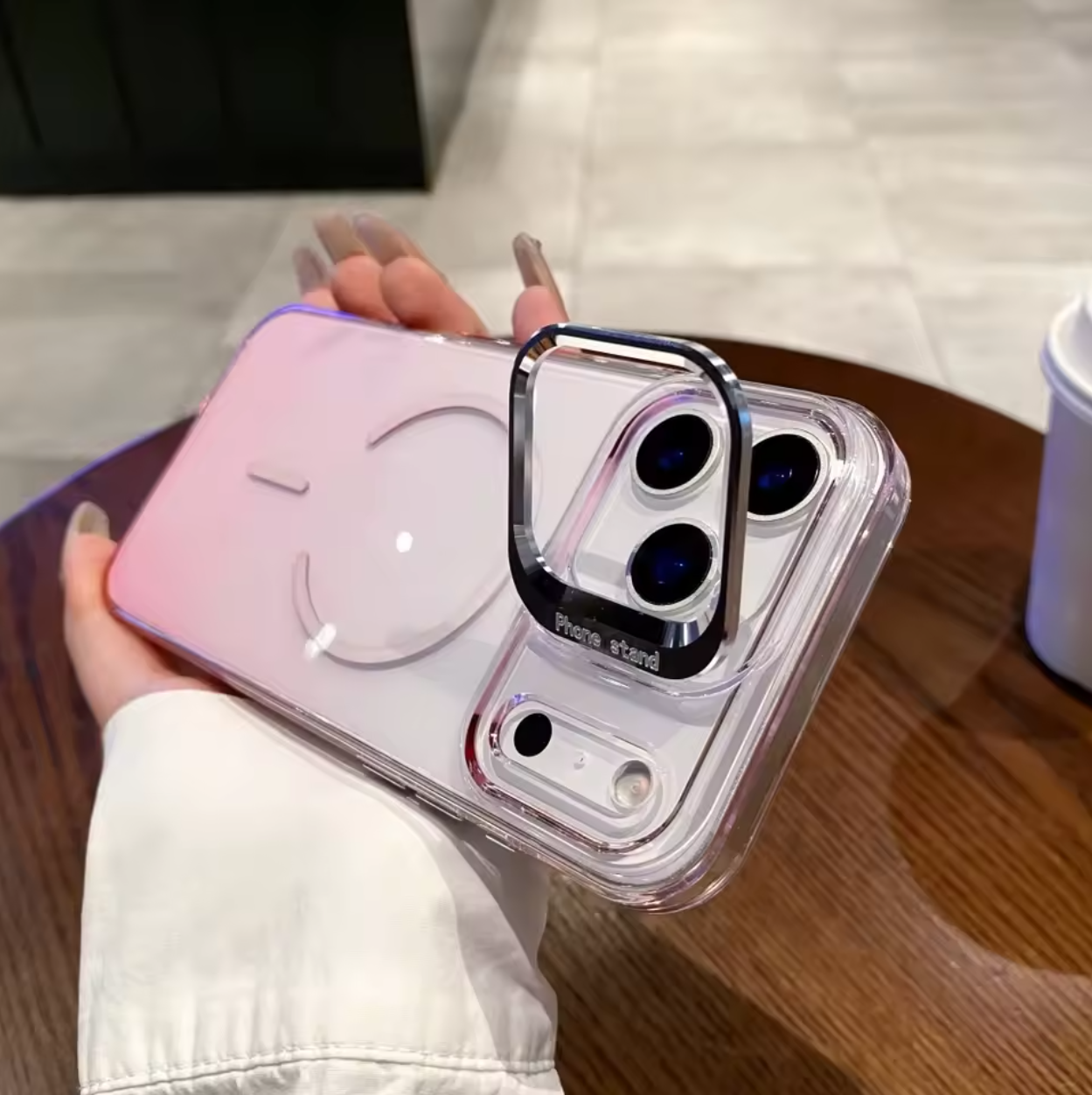 ✨📱 Fashionable, functional, and protective. Camera stand 📸 doubles as a grip, while the gradient transparent design adds elegance. A perfect blend of style and utility 🌈.
